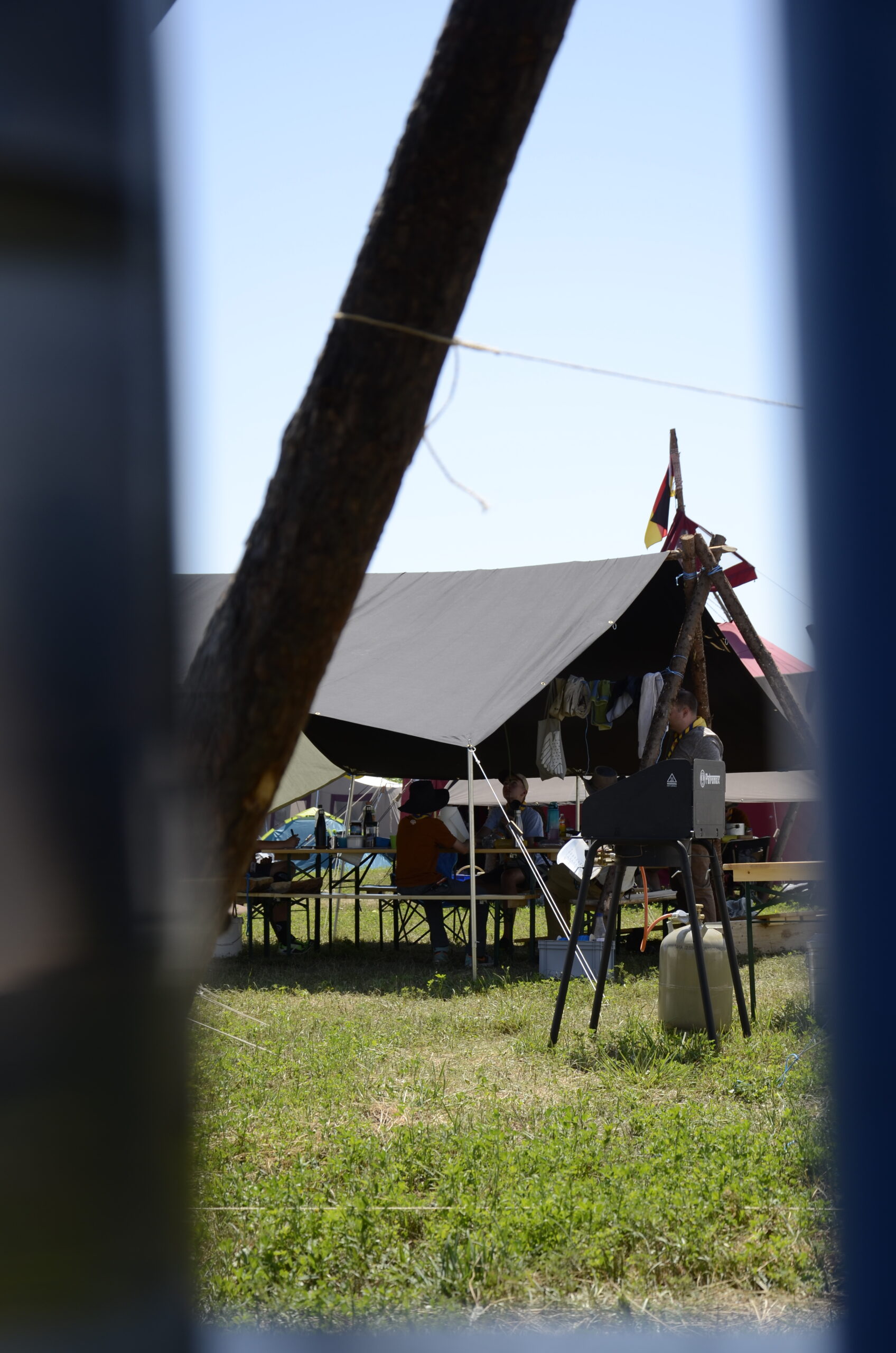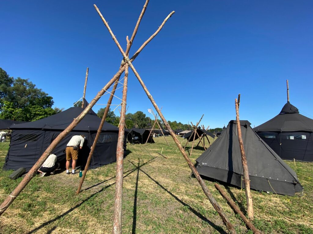 Einige der Rangers aus unserer Region sind bereits einige Tage früher mit Autos und Anhängern angereist und haben das Material transportiert. Nachdem wir den Bus ausgeladen hatten, startete der Aufbau unserer Zelte und Esstische.